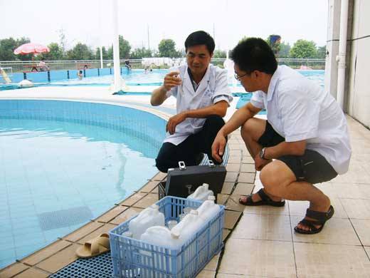 新水放滿后(如當天不能放滿的,則在加入清水清殺藻劑5個小時以后),投加游泳池消毒粉或游泳池消毒片進行消毒,投加量按泳池總水量計算,每1000立方投入4KG,投加時,游泳池消毒粉請先用水溶解后均勻灑入,游泳池消毒片可直接灑入池中。