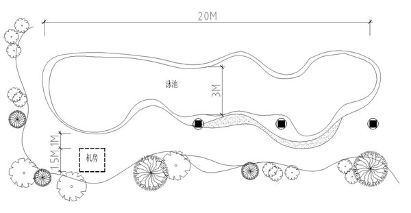 該泳池位于某高級住宅區(qū)的別墅庭院內(nèi),長20米,寬3米,淺端水深1.3米,深端1.7米,平均水深1.5米。整個工程由泳池和一個全地下式簡易機房組成,機房占地1.5*1.5米,高2.0米。設(shè)鋼爬梯上下,井口設(shè)不銹鋼蓋,方便開啟,可以容納所需設(shè)備。