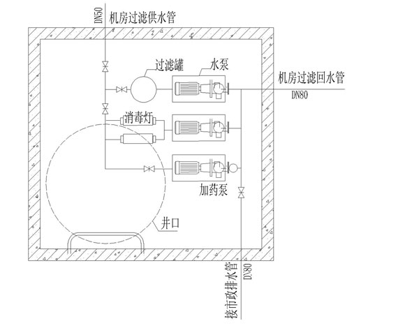 該方案泳池水循環(huán)一般采用順流式循環(huán),回水口設(shè)在池底,在池壁水面下0.5-1.0米處均勻布置出水口。保證水流分布均勻,無短流、渦流及死水域,循環(huán)周期8-10H,循環(huán)次數(shù)3-2.4。泳池消毒采用紫外線消毒,循環(huán)水經(jīng)過消毒后進入泳池。過濾采用高速濾罐,僅在需要時才開啟過濾泵,水質(zhì)達標時不開啟。采用計量加藥泵投加混凝劑,定量加入管網(wǎng)后從給水口加入泳池。