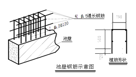三、池壁拆除清理漏出砼池壁頂面,頂面上彈出兩道線間距190mm,留出兩側(cè)25mm鋼筋保護(hù)層,號出打眼植筋間距線為150mm,打眼深為120mm,為膠植鋼筋。