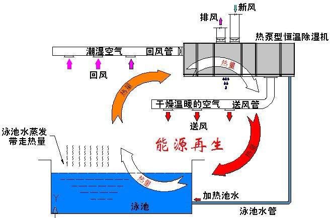 池水的熱損失主要為池水表面蒸發損失,約占總損失的85%,其它如水表面、池底池壁、管道設備等傳導熱損只占總熱損的15%左右。池水表面蒸發,造成游泳館空間空氣濕度變大,如不及時除濕以控制合適的濕度,天花板、墻壁玻璃面上會凝結水滴,造成嚴重的腐蝕,人體也會感覺不舒適。常規的除濕方式既是外排暖濕空氣,補進室外干燥空氣并將其加熱至室溫。由此可見,常規“加熱+空調”方式,能源損失很大,一方面需補充熱量加熱池水,另一方面又需補充熱量加熱空氣,運行能耗費用較高。