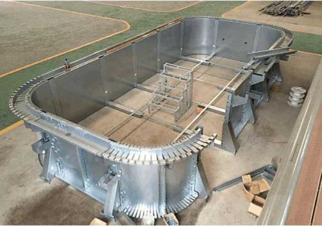 拆裝式泳池是由池體和游泳池水處理系統兩部分組成。池體由鋼架主體結構、內壁承壓防水、外壁裝飾、圍池過道、四周護欄等幾部分組成。一般拆裝式泳池池體的鋼構采用Q-235型熱軋鋼框架結構,以高強度螺栓連接,鏈接螺栓為8.8級,M-14。鋼結構框架、鋼結構溢水槽經過鍍鋅防腐處理,表層還有兩層防腐處理,一層防銹,二層防腐。溢水槽上方一般鋪設溢水格柵,常用寬度規(guī)格有250mm、300mm、400mm等幾種,可根據不同需要進行選擇。內壁承壓板一般為300mm*30mm、單皮厚度為2.5mm的PVC中空板材或者1.5mm的鍍鋁鋅鋼板,泳池防水層厚度為1.2mm的具有抗拉加強筋的進口泳池專用膠膜組成,且膠膜采用高頻焊接制作。外壁裝飾和圍池過道均由優(yōu)質pvc材料制作而成,美觀耐用。四周護欄采用不銹鋼或者碳鋼噴涂材料制成。泳池水處理系統根據泳池蓄水量配置,處理效果可達到《國際泳聯(FINA)游泳池水質衛(wèi)生標準》。