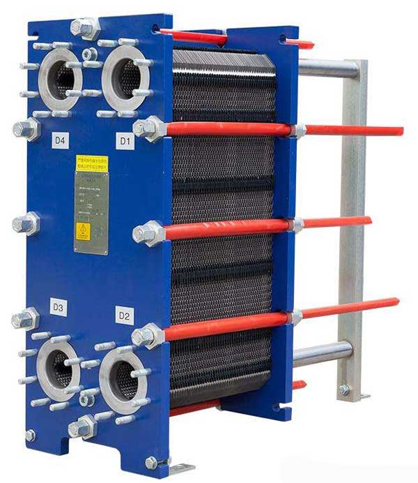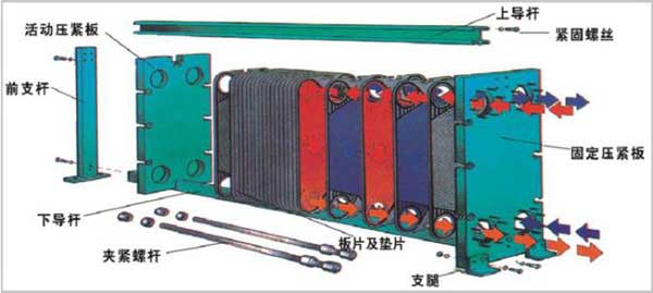 板式換熱器是由一組波紋形的平行金屬板構成的,在板片的4個拐角出都有通道孔,板被夾緊在一個富有連接管的固定板和活動壓緊板的框架中,并用夾緊螺栓加以夾緊。這些鏈接管同板上的通道孔對中,并與熱交換的兩種液體的外部管理相連,傳熱板和活動壓緊板懸掛在頂部承載梁的下面并由底部橫梁使其對準定位。傳熱板本身是有器有特定形狀并被固緊的電熱片密封,以防止外部泄露,并把熱交換的兩種液體按逆流方式交替地流過另一對傳熱板之間的通道內。板片上的波紋不但提高流體的串流程度,并且形成許多接觸點,以承受正常的運行壓力。
